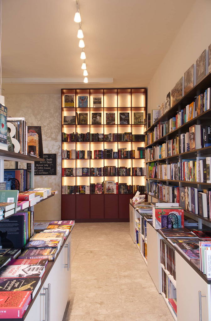 Už při průhledu z náměstí Litovle je jasné, že tohle není obyčejné knihkupectví. Výrazná červená v kombinaci s krémovými tóny a nepřehlédnutelný květinový lustr vytvářejí interiér, který nepřehlédnete.