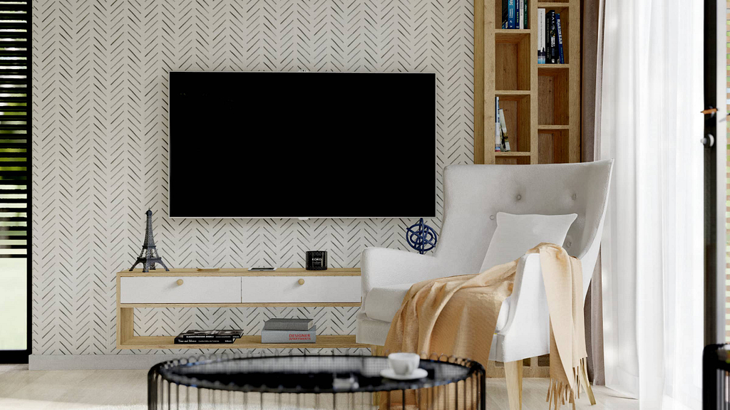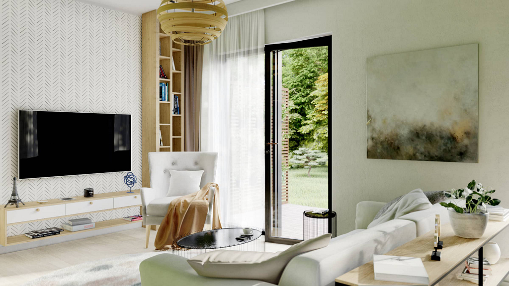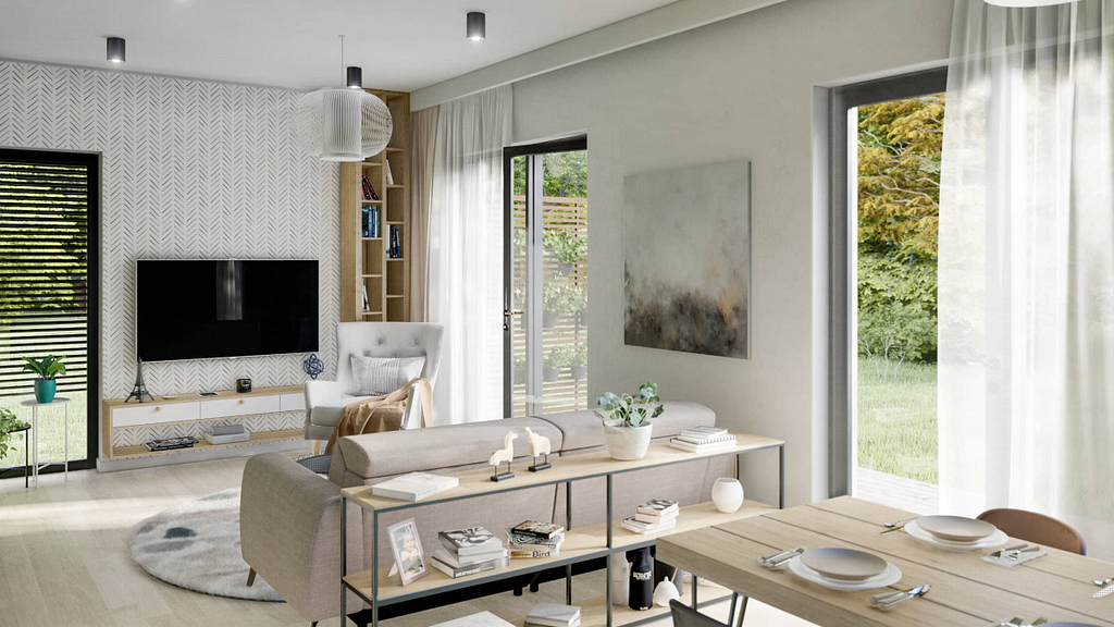 Návrh obývacího pokoje v malém rodinném domě. Obývací pokoj je propojený s jídelnou a je v přímém kontaktu s terasou. Obývací pokoj je navržený ve světlých a přírodních tónech ve skandinávském stylu. V návrhu je použitý abstraktní obraz od Luciano art.