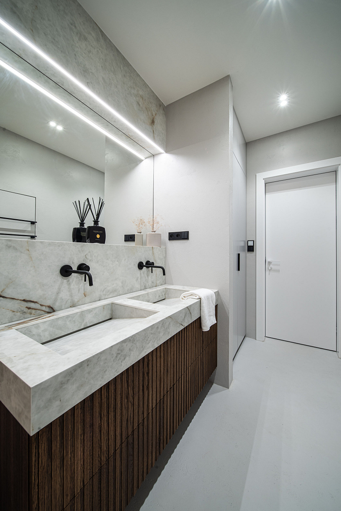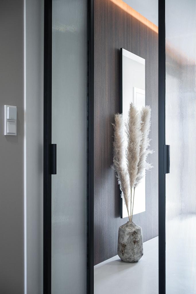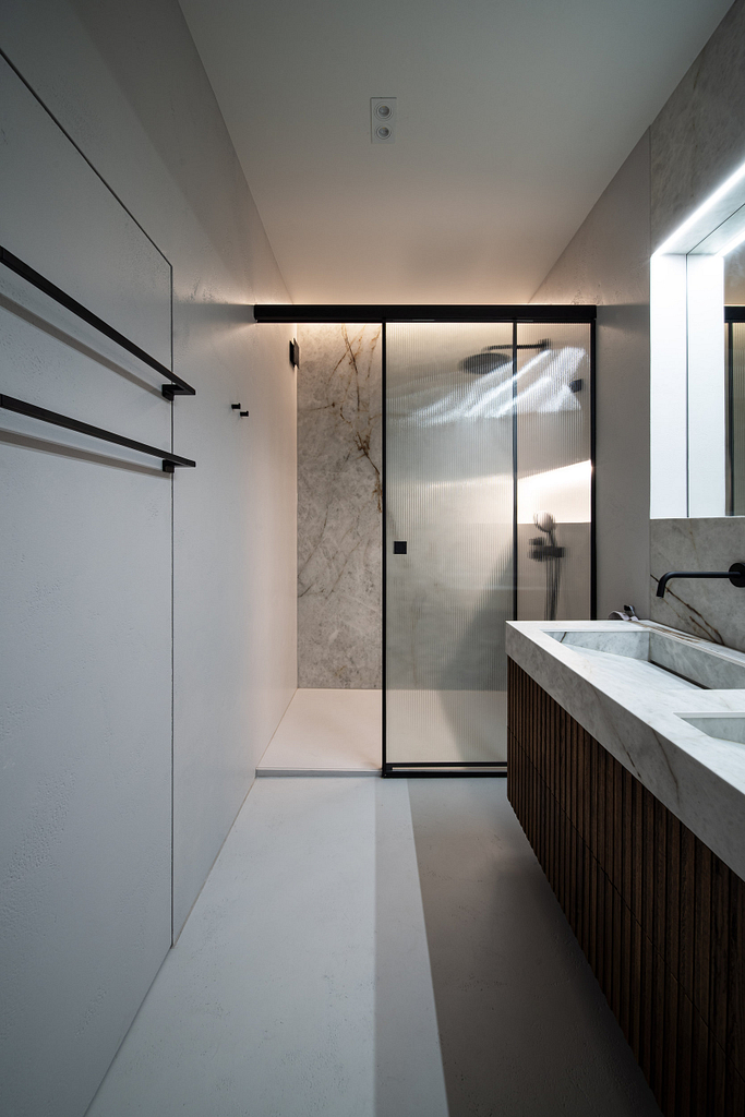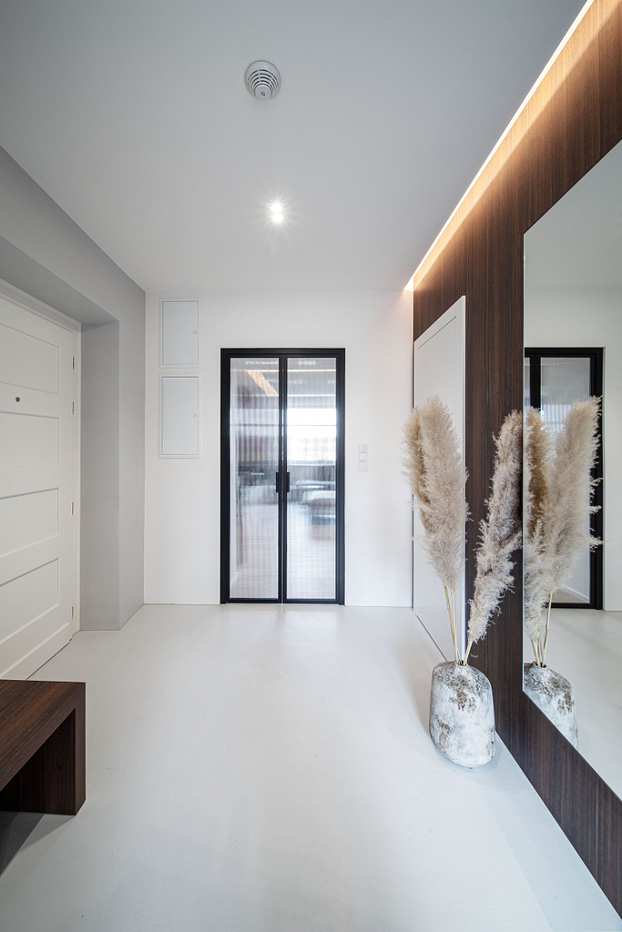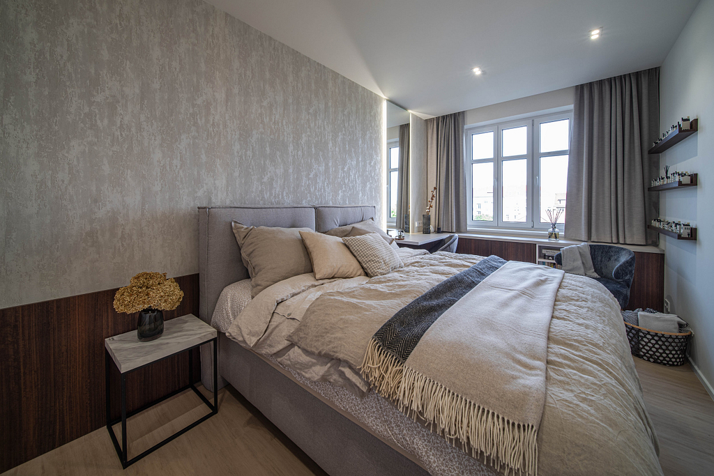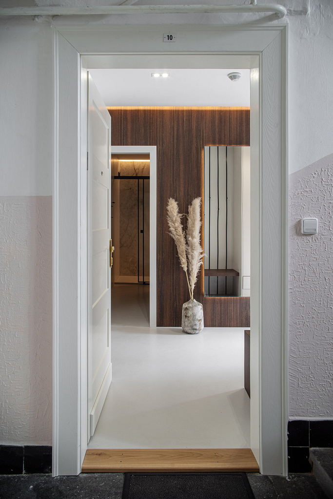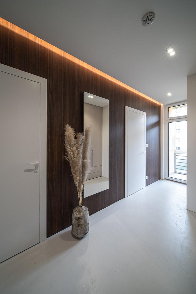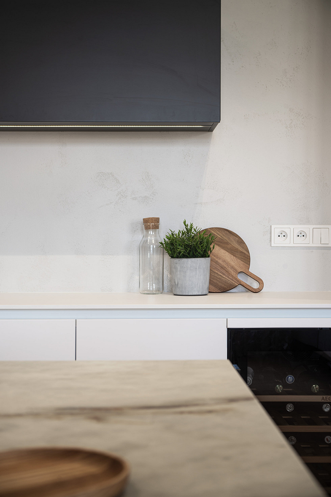 Dispozice bytu prošla zásadní proměnou, díky které vznikl velký obytný prostor kuchyně a obývacího pokoje. Moderní rekonstrukce, ale zároveň funkčně zařízený interiér, vychází z přírodních dekorů a barev. Kombinace bílé a krémové barvy se stěrkou a dřevodekorem Cleaf sablé LR28 patese jsou doplněny černými doplňky. V bytě je použita velkoformátová keramika Neolith Himalaya Crystal a krásné dekorativní sklo AGC Imagin Raywall 90T, které působí velice efektně, propouští dostatek světla a zároveň poskytuje soukromí. Vzdušný byt o nové dispozici 3+kk tvoří obývací pokoj s kuchyní, dvě ložnice, koupelna, samostatná toaleta a chodba se vstupem na balkon.