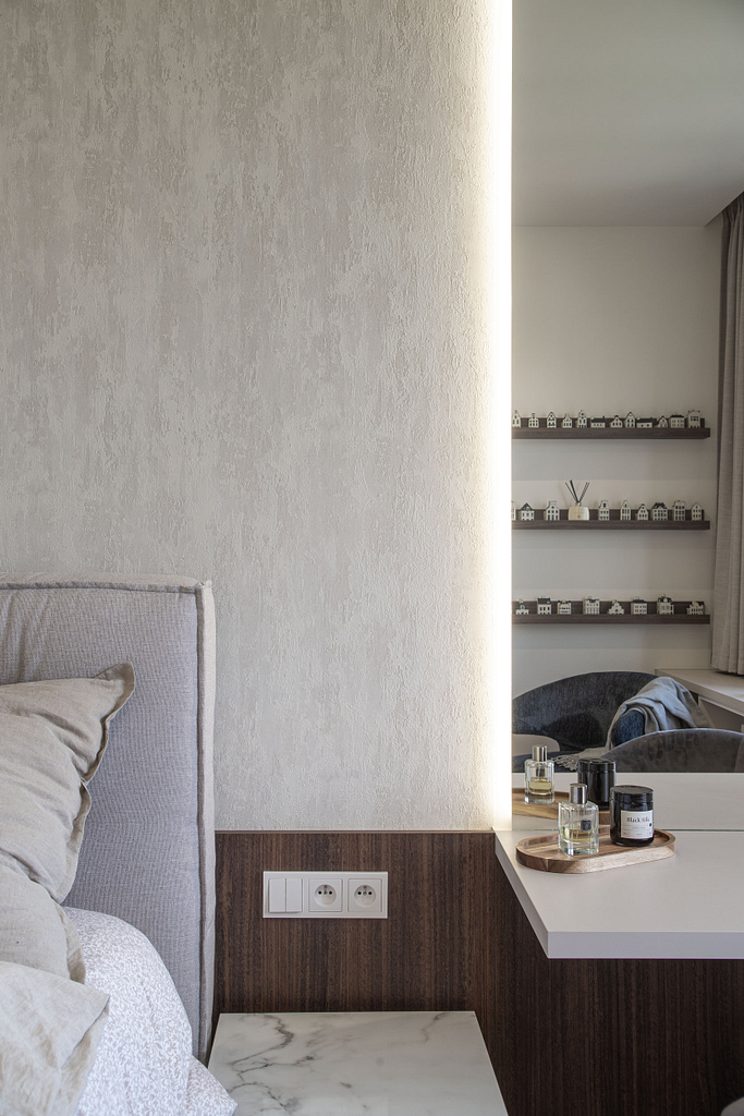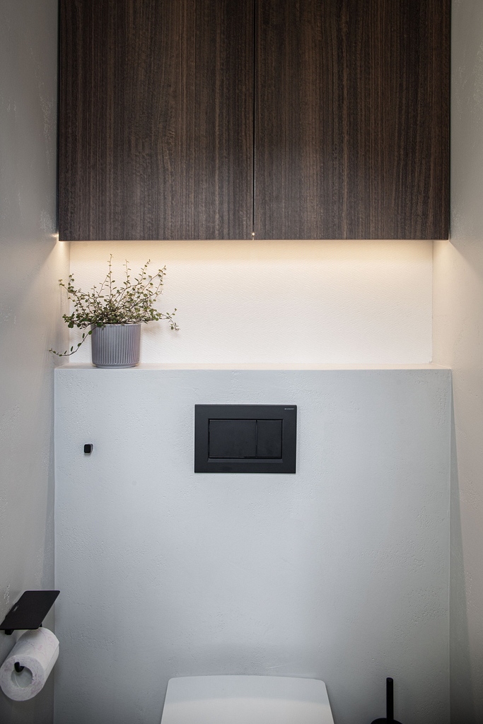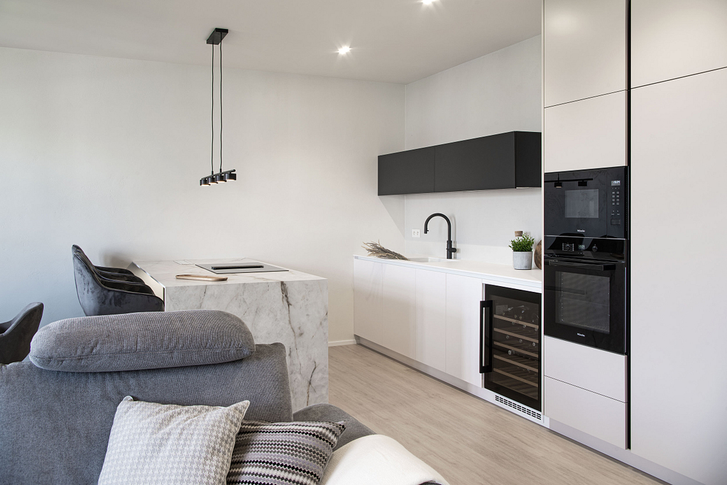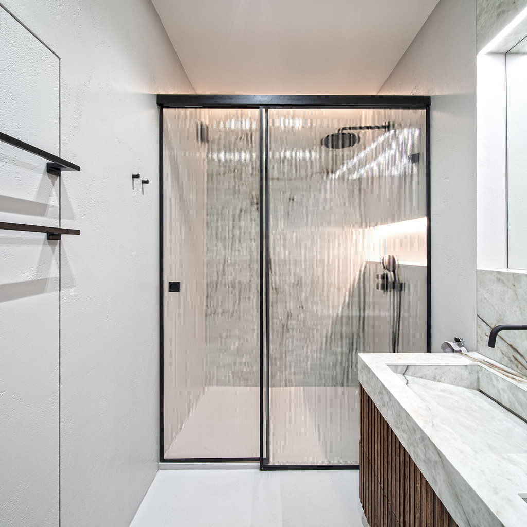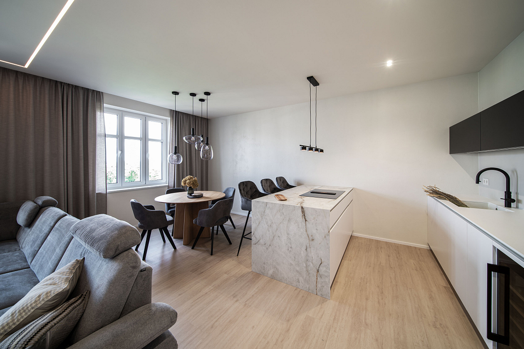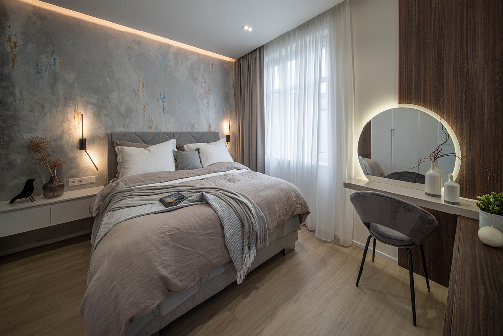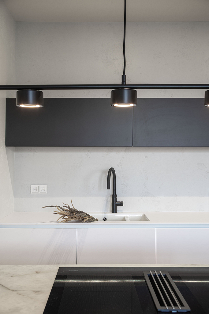 Dispozice bytu prošla zásadní proměnou, díky které vznikl velký obytný prostor kuchyně a obývacího pokoje. Moderní rekonstrukce, ale zároveň funkčně zařízený interiér, vychází z přírodních dekorů a barev. Kombinace bílé a krémové barvy se stěrkou a dřevodekorem Cleaf sablé LR28 patese jsou doplněny černými doplňky. V bytě je použita velkoformátová keramika Neolith Himalaya Crystal a krásné dekorativní sklo AGC Imagin Raywall 90T, které působí velice efektně, propouští dostatek světla a zároveň poskytuje soukromí. Vzdušný byt o nové dispozici 3+kk tvoří obývací pokoj s kuchyní, dvě ložnice, koupelna, samostatná toaleta a chodba se vstupem na balkon.