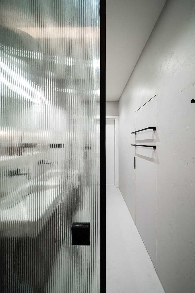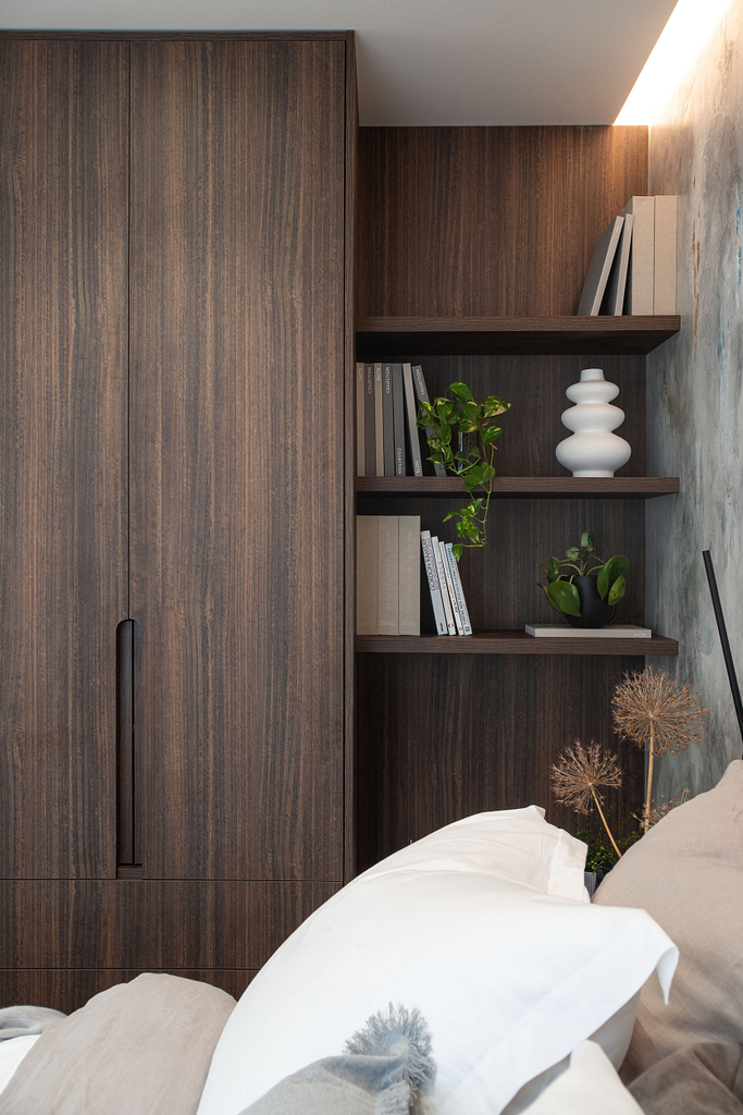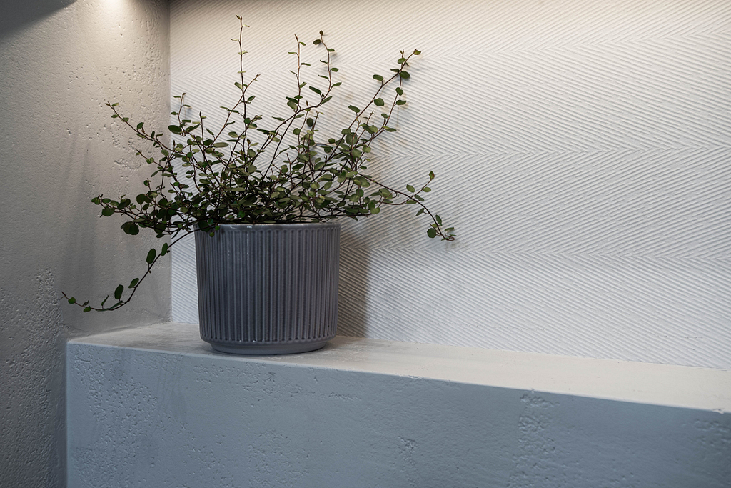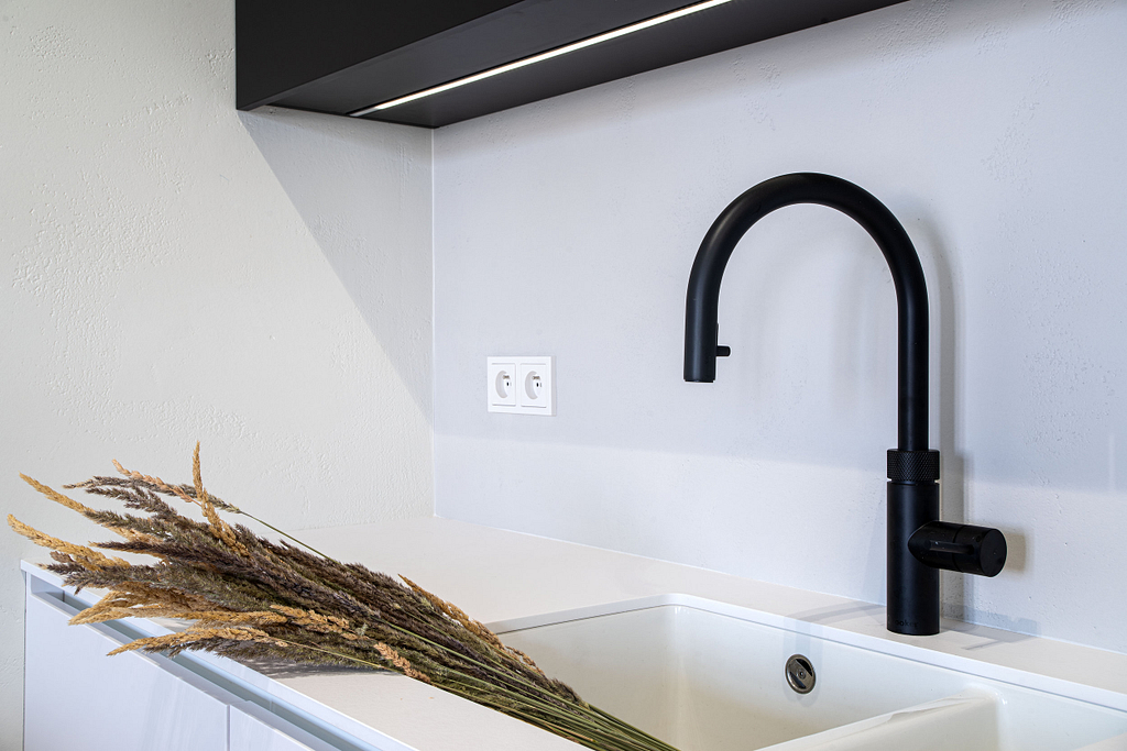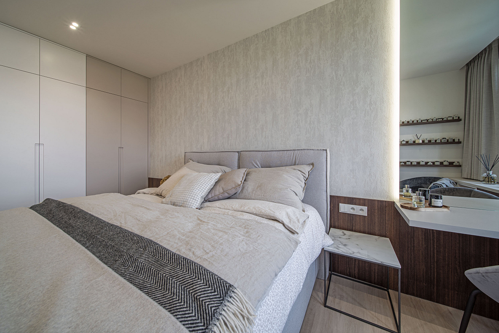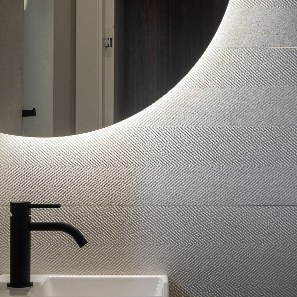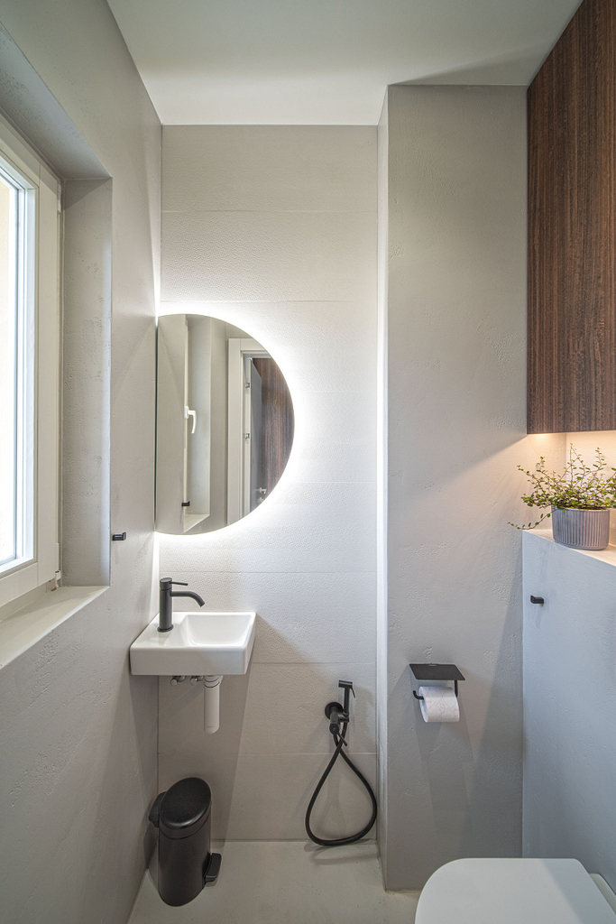 Dispozice bytu prošla zásadní proměnou, díky které vznikl velký obytný prostor kuchyně a obývacího pokoje. Moderní rekonstrukce, ale zároveň funkčně zařízený interiér, vychází z přírodních dekorů a barev. Kombinace bílé a krémové barvy se stěrkou a dřevodekorem Cleaf sablé LR28 patese jsou doplněny černými doplňky. V bytě je použita velkoformátová keramika Neolith Himalaya Crystal a krásné dekorativní sklo AGC Imagin Raywall 90T, které působí velice efektně, propouští dostatek světla a zároveň poskytuje soukromí. Vzdušný byt o nové dispozici 3+kk tvoří obývací pokoj s kuchyní, dvě ložnice, koupelna, samostatná toaleta a chodba se vstupem na balkon.