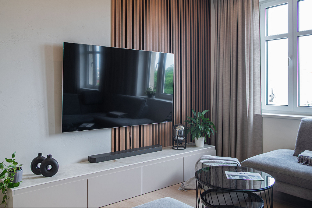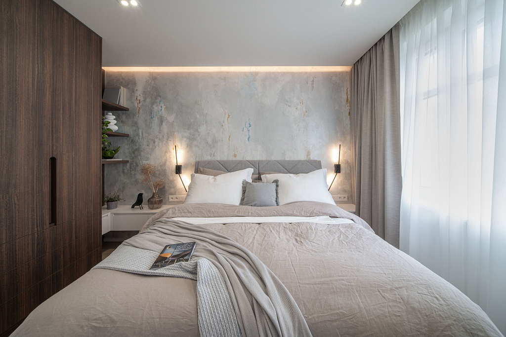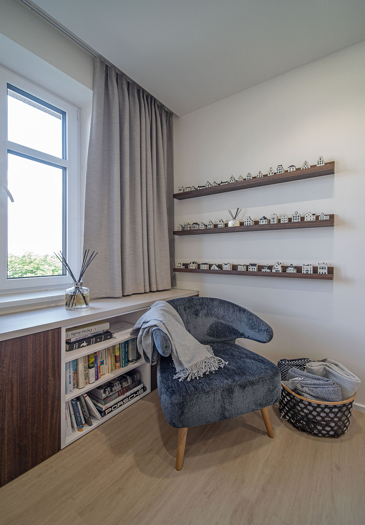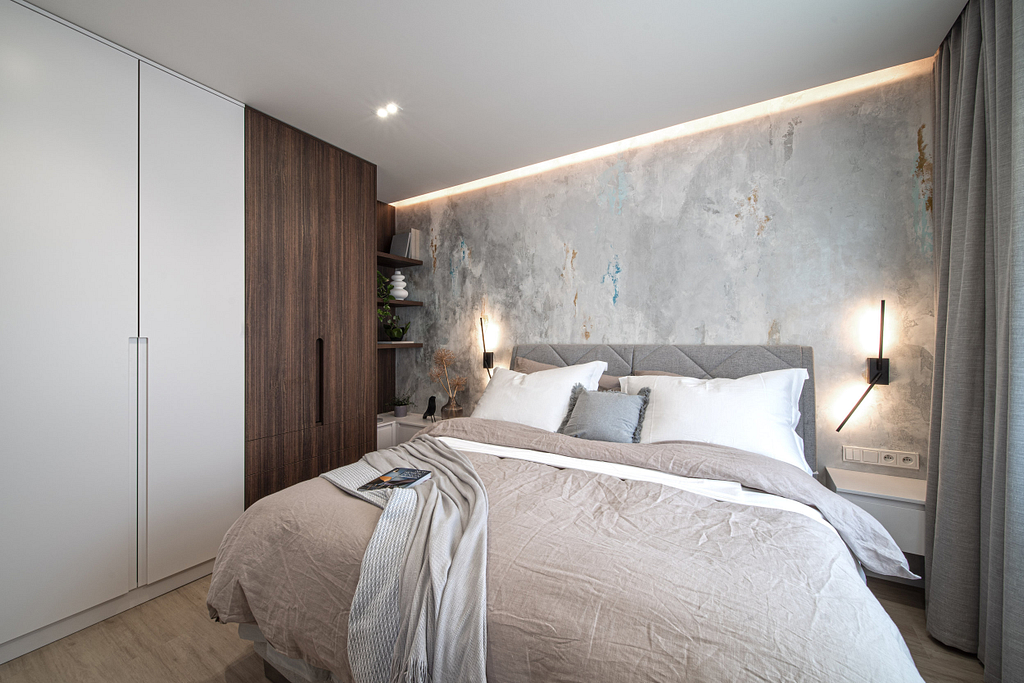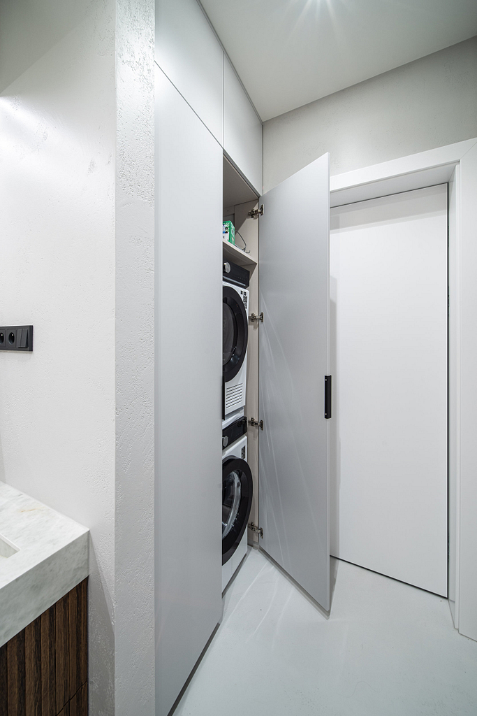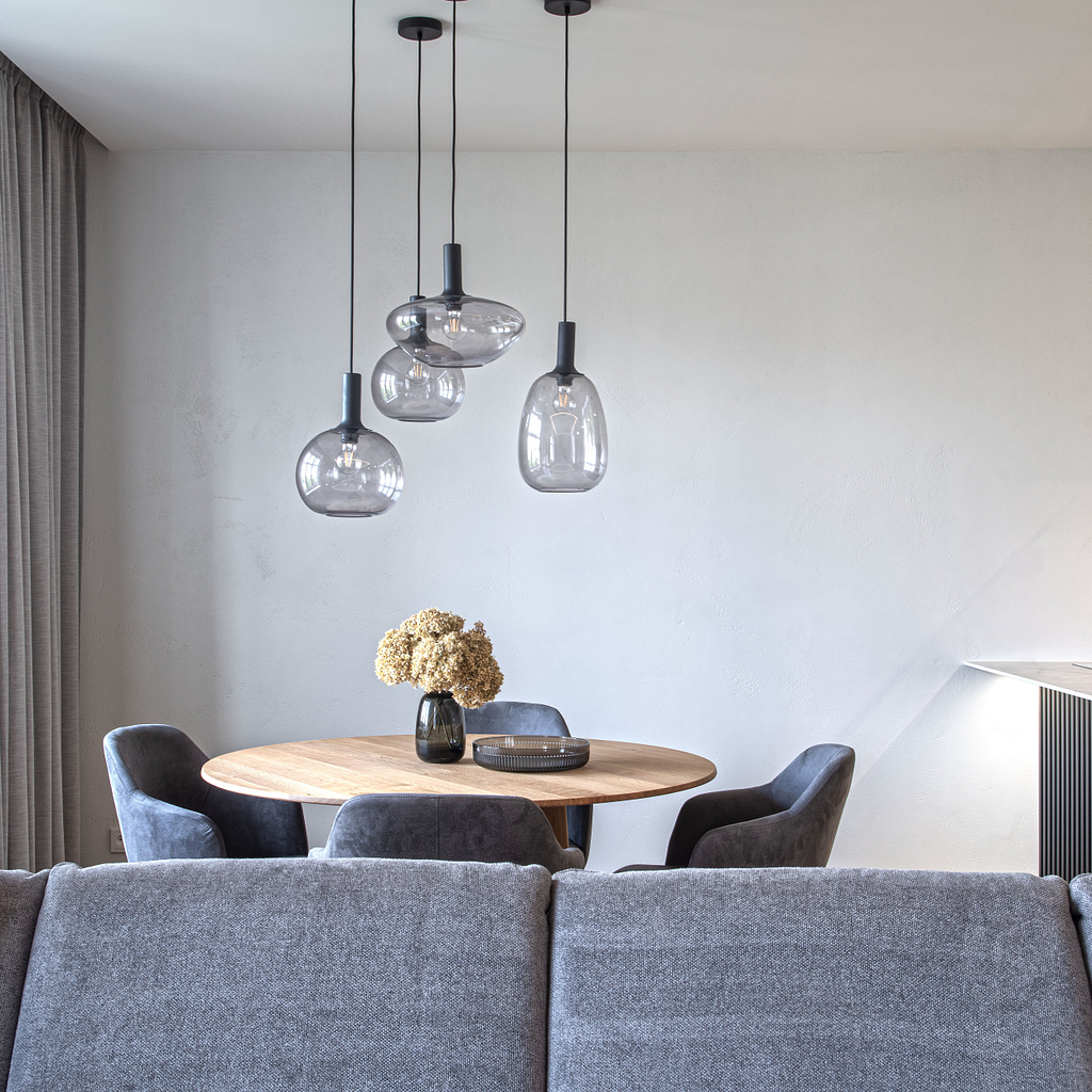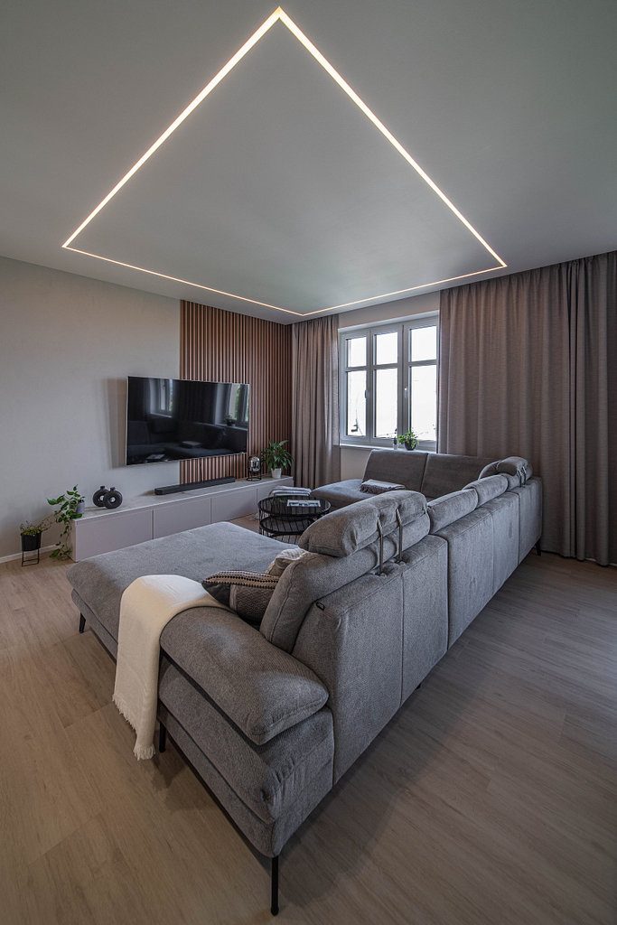 Dispozice bytu prošla zásadní proměnou, díky které vznikl velký obytný prostor kuchyně a obývacího pokoje. Moderní rekonstrukce, ale zároveň funkčně zařízený interiér, vychází z přírodních dekorů a barev. Kombinace bílé a krémové barvy se stěrkou a dřevodekorem Cleaf sablé LR28 patese jsou doplněny černými doplňky. V bytě je použita velkoformátová keramika Neolith Himalaya Crystal a krásné dekorativní sklo AGC Imagin Raywall 90T, které působí velice efektně, propouští dostatek světla a zároveň poskytuje soukromí. Vzdušný byt o nové dispozici 3+kk tvoří obývací pokoj s kuchyní, dvě ložnice, koupelna, samostatná toaleta a chodba se vstupem na balkon.