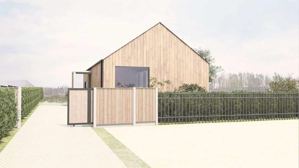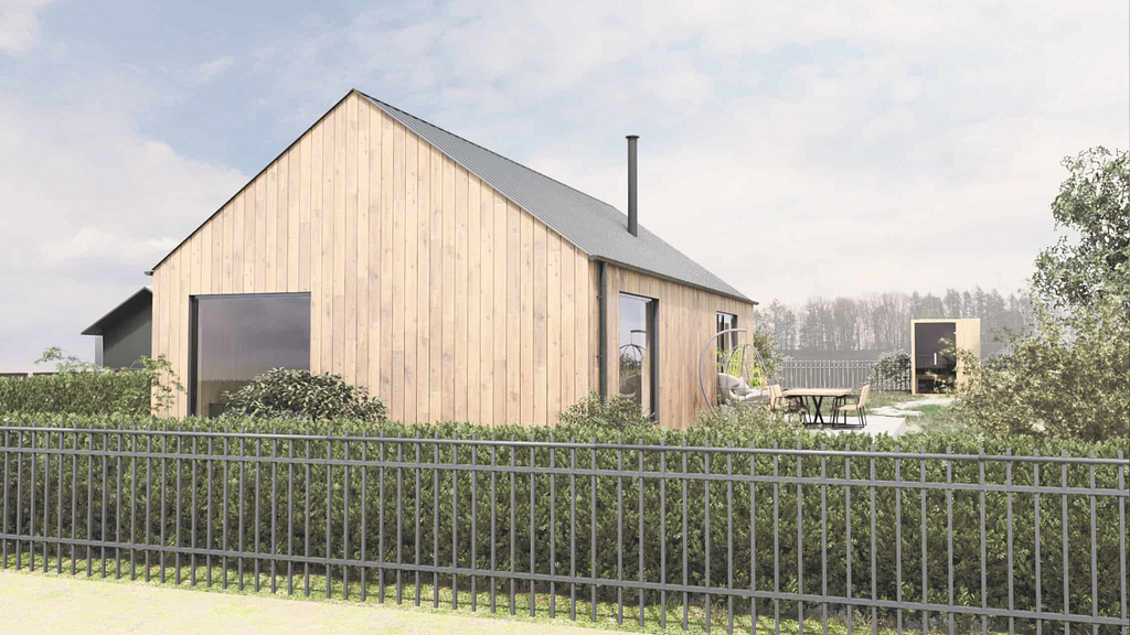 Návrh domu s možností trvalého bydlení. Víkendový dům s výhledem vychází z hlavních požadavků klienta – prosklený štít, výhledy do krajiny, velký společný prostor přístupný rovnou od vstupních dveří a otevřené podkroví. Dům je s aktuální dispozicí 3+kk možné rozšířit na 4+kk právě díky prostoru v podkroví, které je nyní navrženo jako spací patro pro návštěvy a úložný prostor.