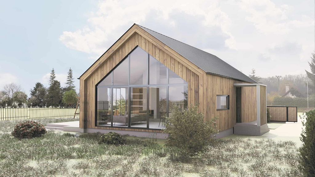 Dům s dřevěnou fasádou a proskleným štítem směrem do krajiny.